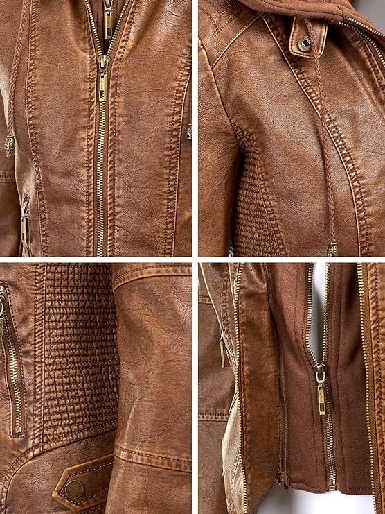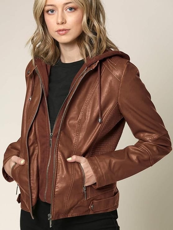 Elevate your wardrobe with the Women’s Removable Hooded Leather Jacket, a fusion of style and functionality designed to complement your fashion-forward lifestyle. Crafted from high-quality real leather, this jacket exudes durability and a luxurious feel, ensuring it withstands the test of time while offering premium comfort. Whether you’re navigating the urban jungle or exploring new adventures, this versatile piece is your perfect companion.