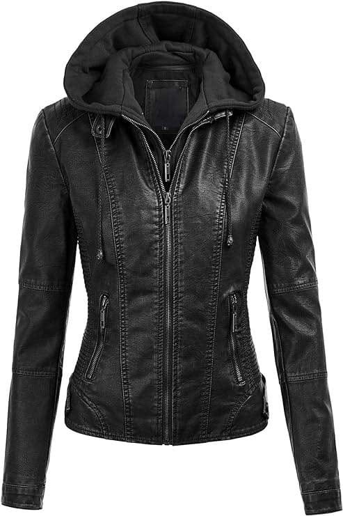 Lock and Love Women’s Removable Hooded Leather Jacket Moto Biker Coat – Black