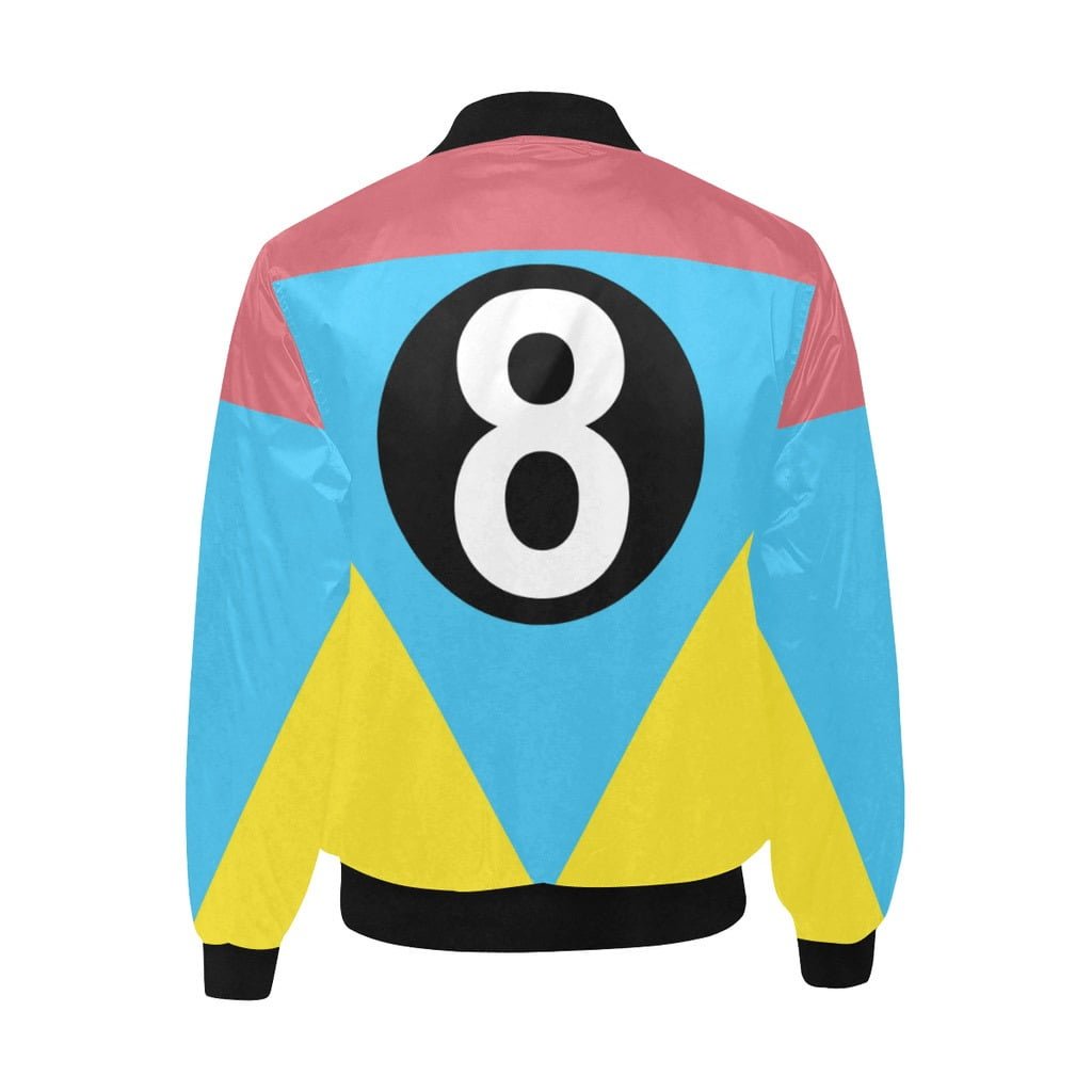 - Design: Classic bomber jacket style with an all-over print of colorful 8 balls.