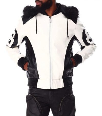 Men’s 8 Ball Leather Hooded Bomber Jacket White/Black