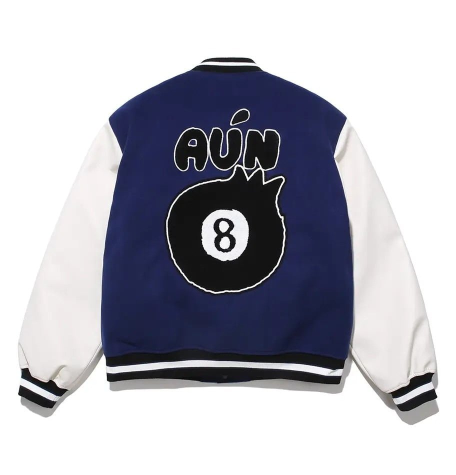 - Design: Varsity jacket with a navy color scheme and bold 8 ball accents.