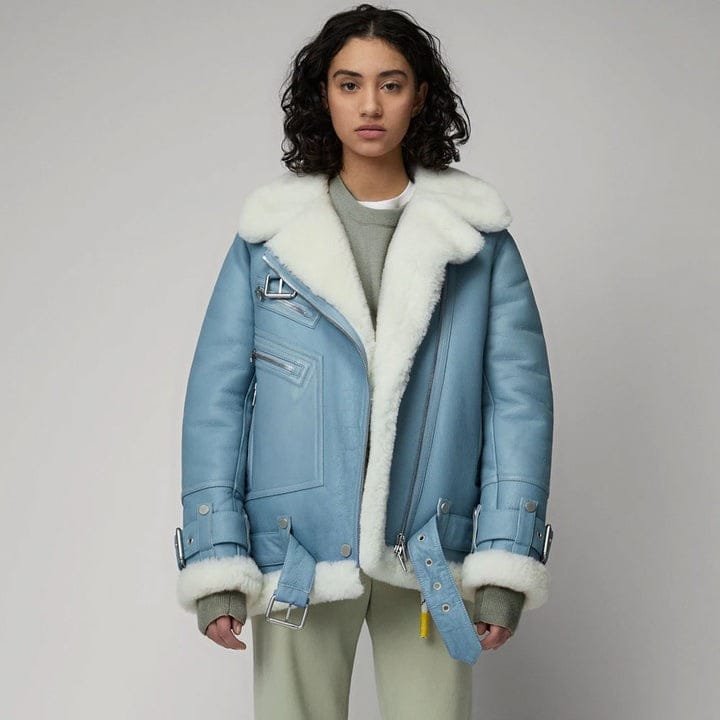A. Our Women Light Blue B3 RAF Aviator Styled Sheepskin Shearling Leather Jacket is available in a range of sizes. Please refer to our size chart for the perfect fit.