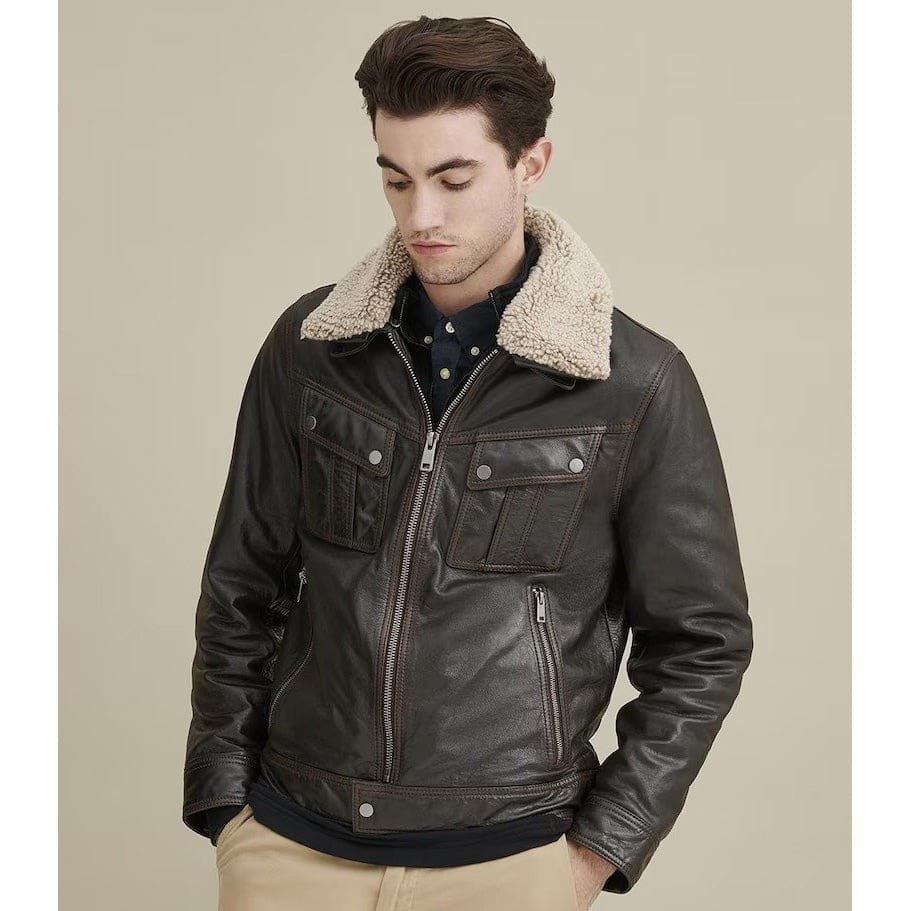 Men’s Black Leather Shearling Collar Jacket