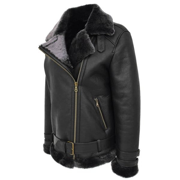 Women’s Sheepskin Aviator Cross Zip Pilot Jacket Lena Black