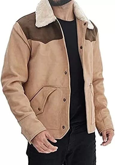Elevate your look with the Yellowstone Kevin Costner John Dutton Beige Suede Leather Jacket with Fur Collar